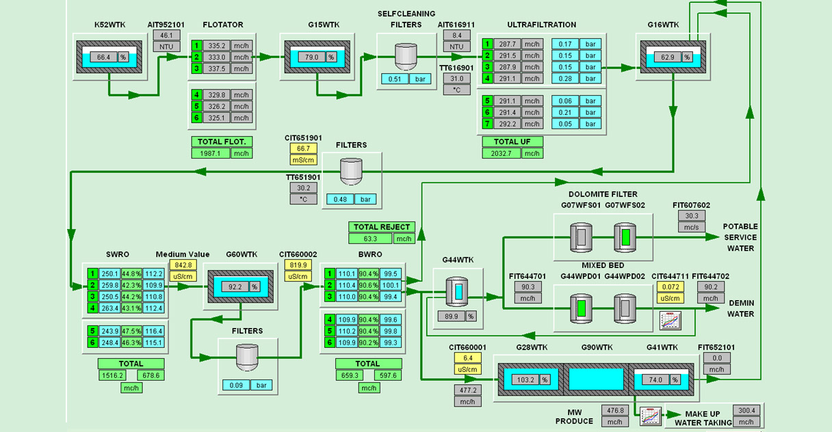 El proceso de tratamiento tiene un intake de agua de mar de acerca 1500 m3/h (para cada planta) que, después de haber cruzado diferentes step, produce tres output diferentes. El primero stream es compuesto por 600 m3/h de agua de make up (conducibilidad media ~ 10 µS/cm) producidas da líneas de ósmosis seawater y brackish. El segundo stream, tratado después de la sección de intercambio de iones con función de polishing, es constituido por 90 m3/h de agua desmineralizada (conducibilidad media < 1 µS/cm). Un tercero output es constituido por 30 m3/h de agua desmineralizada para hacerla utilizable como agua potable para los servicios de las acerÍas.